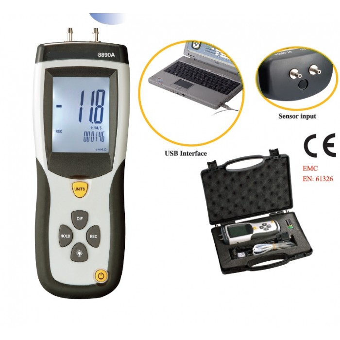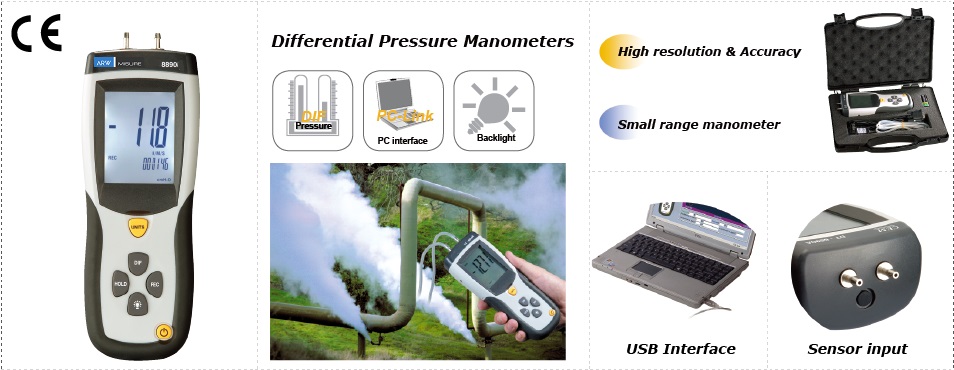 The portable and digital instrument ARW-8890 is a differential pressure meter equipped with a large backlit display with a measurement range from 0 to +/-5 psi and with the possibility of choosing 11 different units of measurement: bar, mmHg, ozin2 , kgcm2, psi, inH2O, kPa, ftH2O inHg, cmH2O, mbar, kPa.