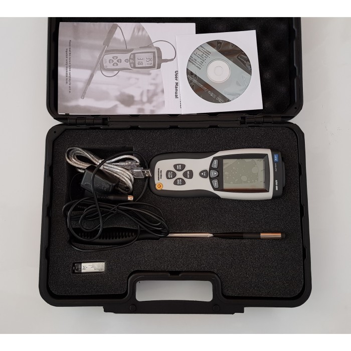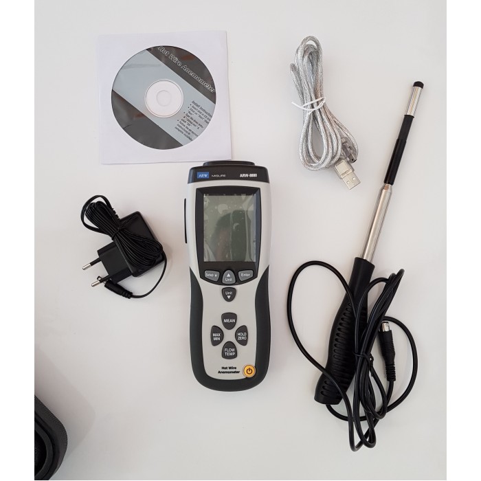 The ARW-8880 Hot Wire Thermo Anemometer is supplied complete with a telescopic speed and temperature measuring probe (from 300mm to 1100mm), battery, ABS carrying case, USB interface cable and Software.
