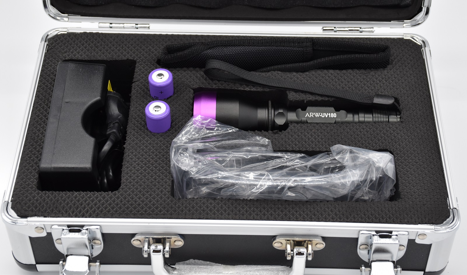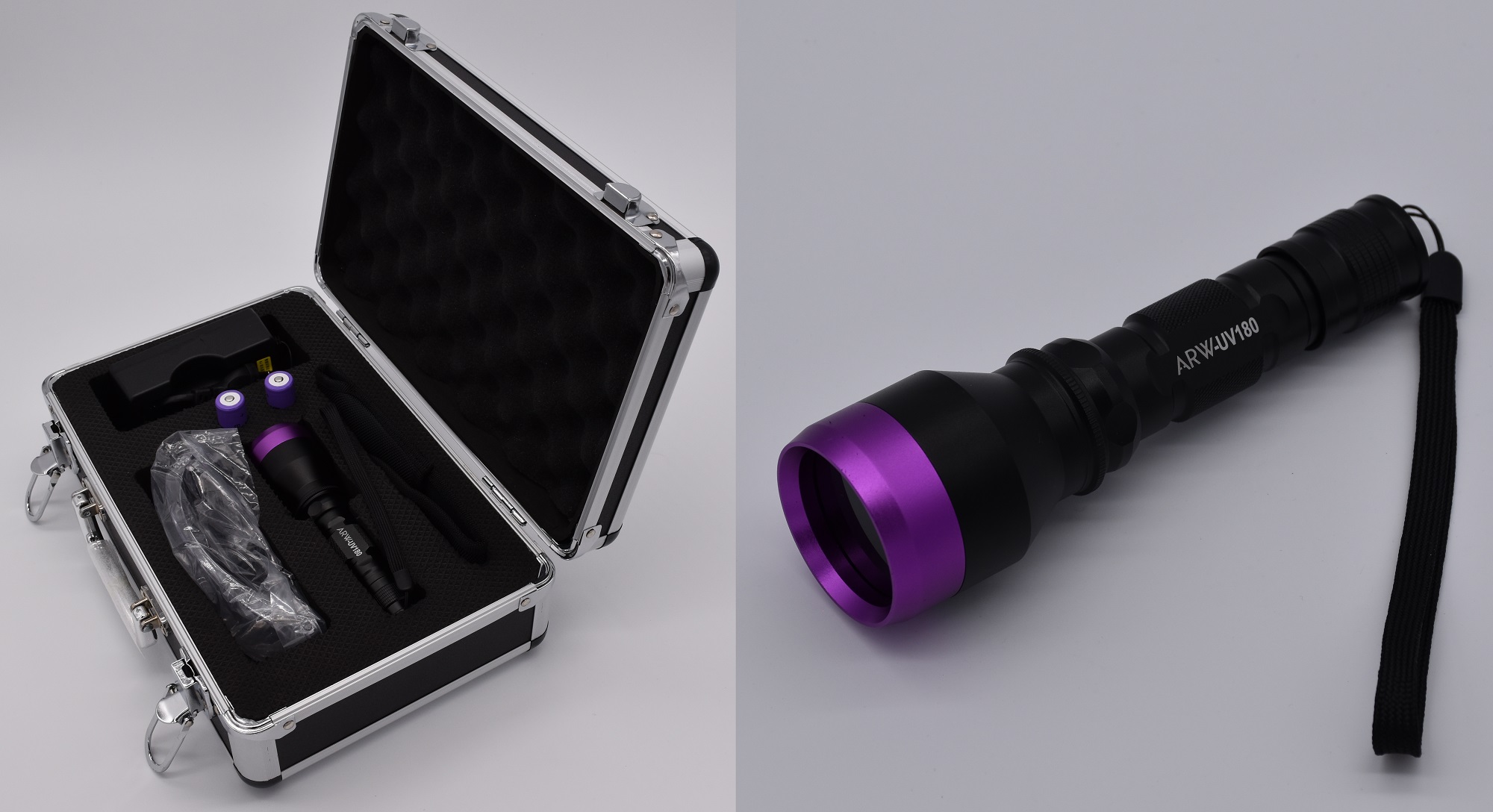 It is a small flashlight equipped with lithium batteries with LED cold light technology that offers a duration of approximately 50,000 hours of use. ARW-UV180 UV lamp produce a powerful concentrated and constant ultraviolet light, the on/off button is positioned behind the lamp to prevent accidental start-up and the battery is charged for about 6 hours using normal power outlets.