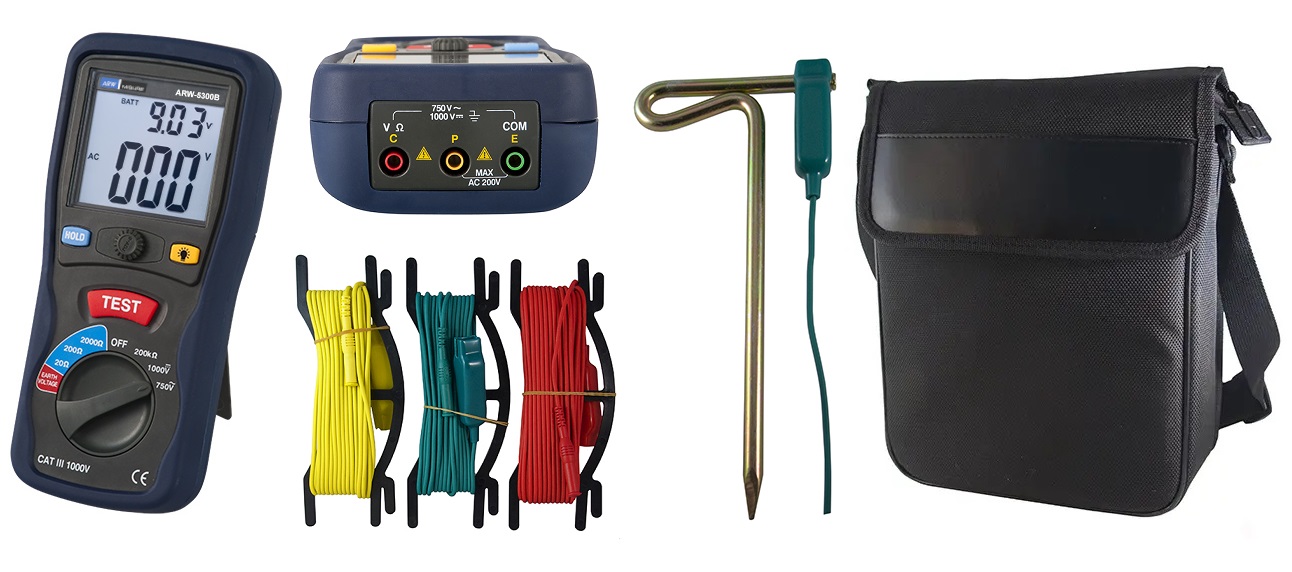 The ARW-5300B digital earth resistance meter is an instrument equipped with high electronic technology thanks to which it is possible to obtain high precision measurements in the civil and industrial sector. This Detector is used by electrical installers, maintenance services and testing on industrial production lines of electrical equipment. The delivery kit includes 6 AA batteries, cables, pegs, user manual and case.