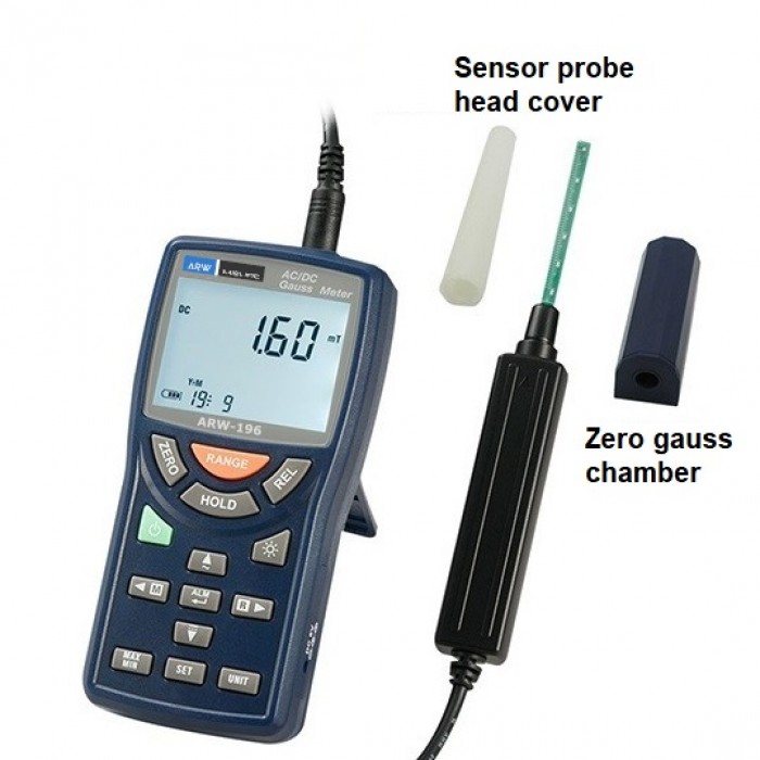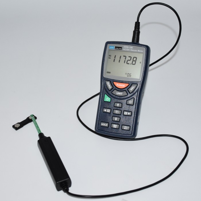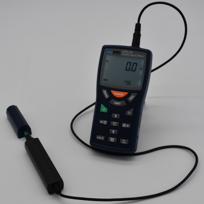The ARW-196 Digital Gaussmeter is an instrument used to perform accurate measurements of AC and DC magnetic fields. It is a portable instrument equipped with a backlit LCD display with automatic power off and equipped with a transverse uniaxial Hall effect probe with automatic temperature compensation.