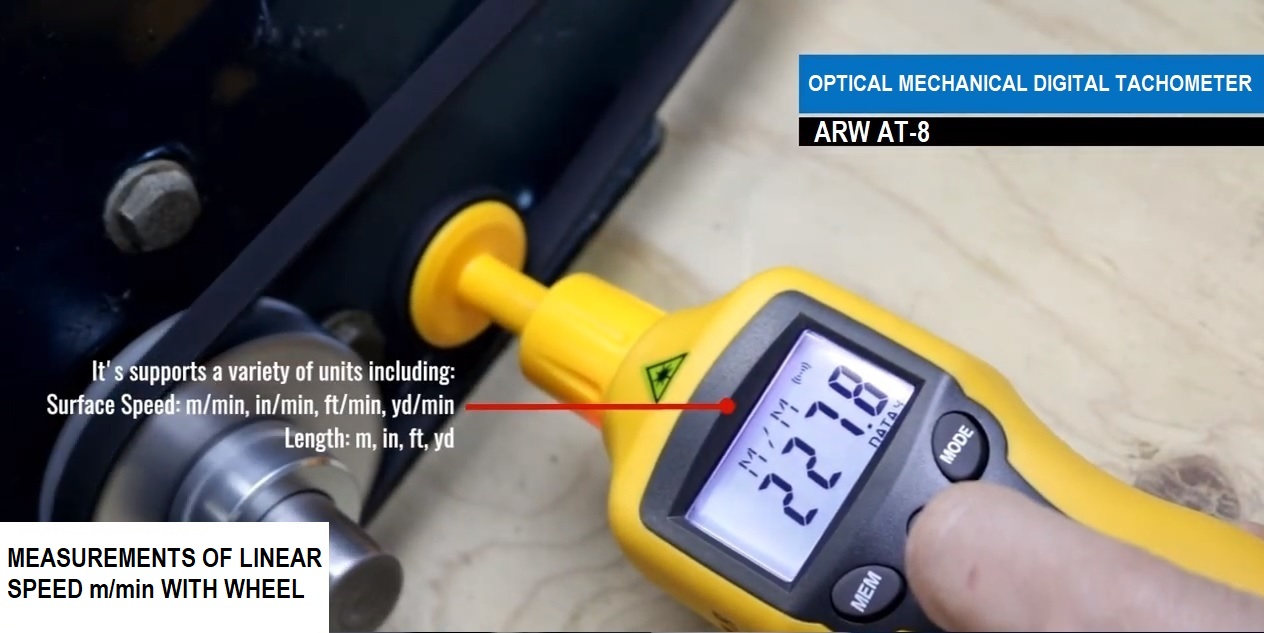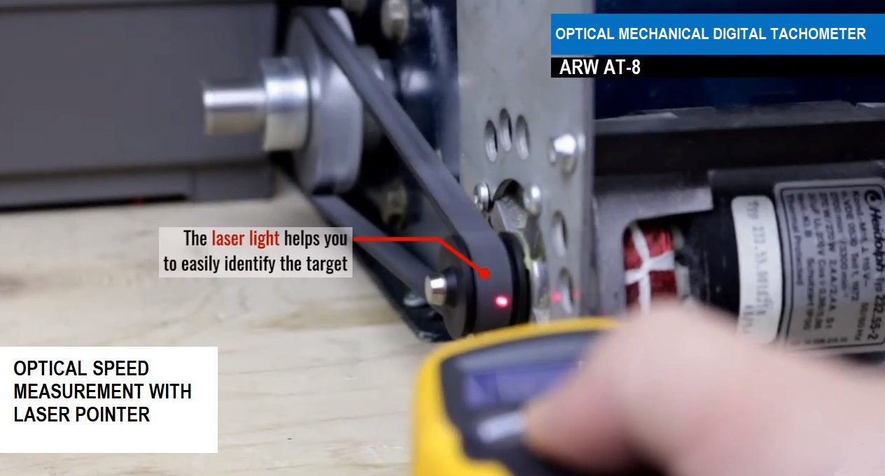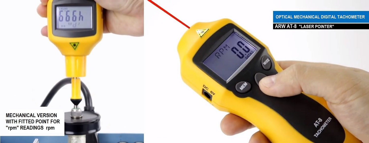 The ARW AT-08 tachometer is a dual technology portable tachometer with both optical and mechanical reading with the use of an interlocking system equipped with a tip for measuring the speed of rotation "RPM" rotations per minute and a wheel for the linear speed, meters per minute. In optical mode, this speedometer is equipped with a laser pointer to facilitate the centering of the object to be measured.