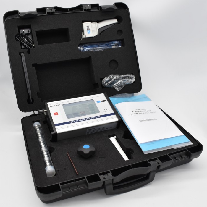 The ARW-T05A Automatic Pull-off Tester is a digital instrument used to measure the degree of adhesion of a coating using the pull-off method. The method consists of detecting the force required to extract a specified test diameter of the coating from its substrate using hydraulic pressure. The pressure is displayed on a digital LCD and represents the adhesion strength of the coating to the substrate.